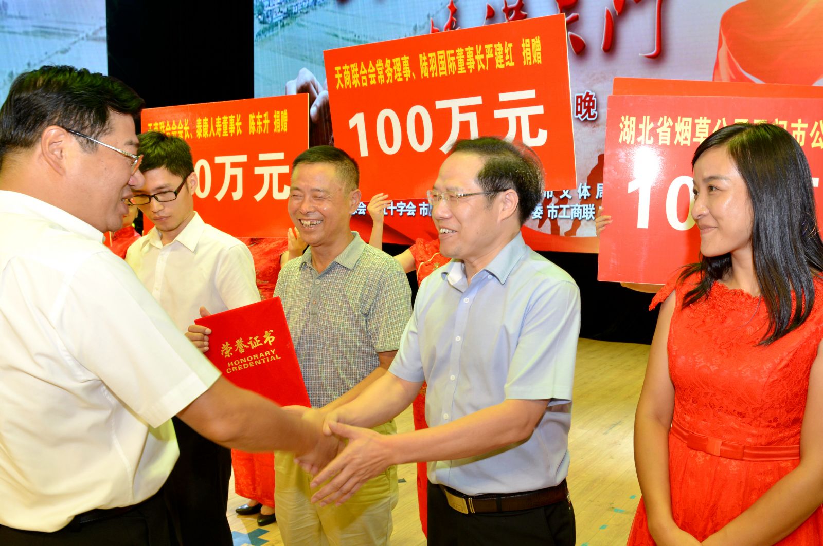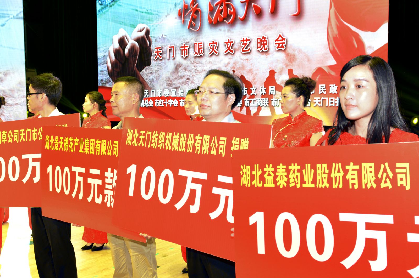 2016年9月2日晚,涼風習習,星光燦爛。由天門市委市政府主辦的主題為"風雨共舟,情滿天門"的賑災義演晚會拉開序幕。湖北天門紡織機械股份有限公司心系今夏受百年洪澇災害的天門袍澤,慷慨伸出援助之手,繼前三次捐款捐物后,在義演會上再次捐贈100萬元人民幣。