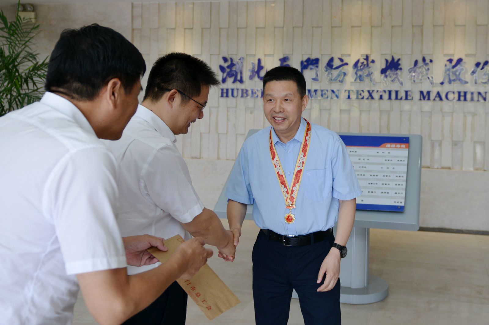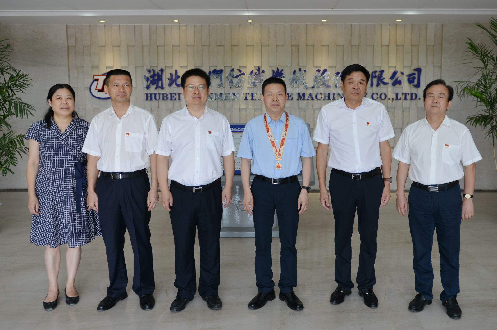 9月30日上午,天門市委、市政府及總工會相關領導來到天門紡機,為董事長沈方勇頒發由中共中央、國務院、中央軍委授予的“慶祝中華人民共和國七十周年”紀念章,并與沈方勇董事長親切合影留念。