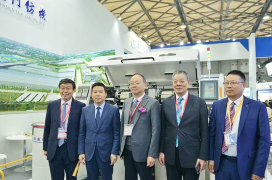 中紡聯黨委書記、秘書長高勇(左3)、中紡聯副會長楊紀朝(右2)、中國紡織機械協會總工程師祝憲民(左1)在天門紡機展位上合影