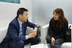 中國紡織工業聯合會黨委書記、秘書長高勇(左1)聽取董事長沈方勇介紹參展情況