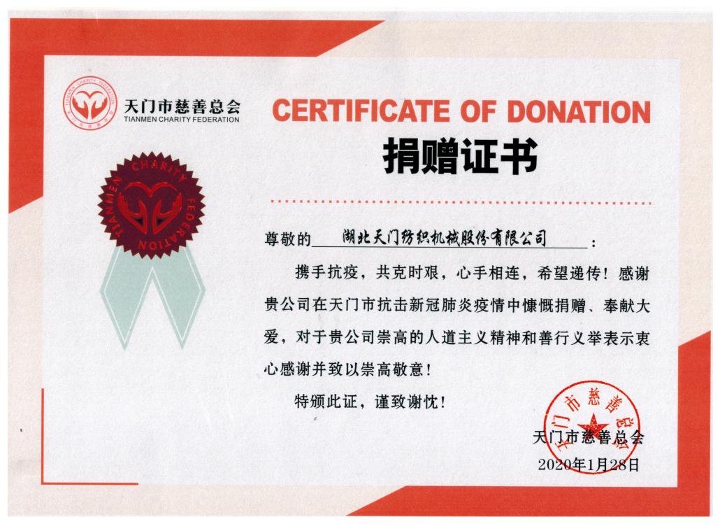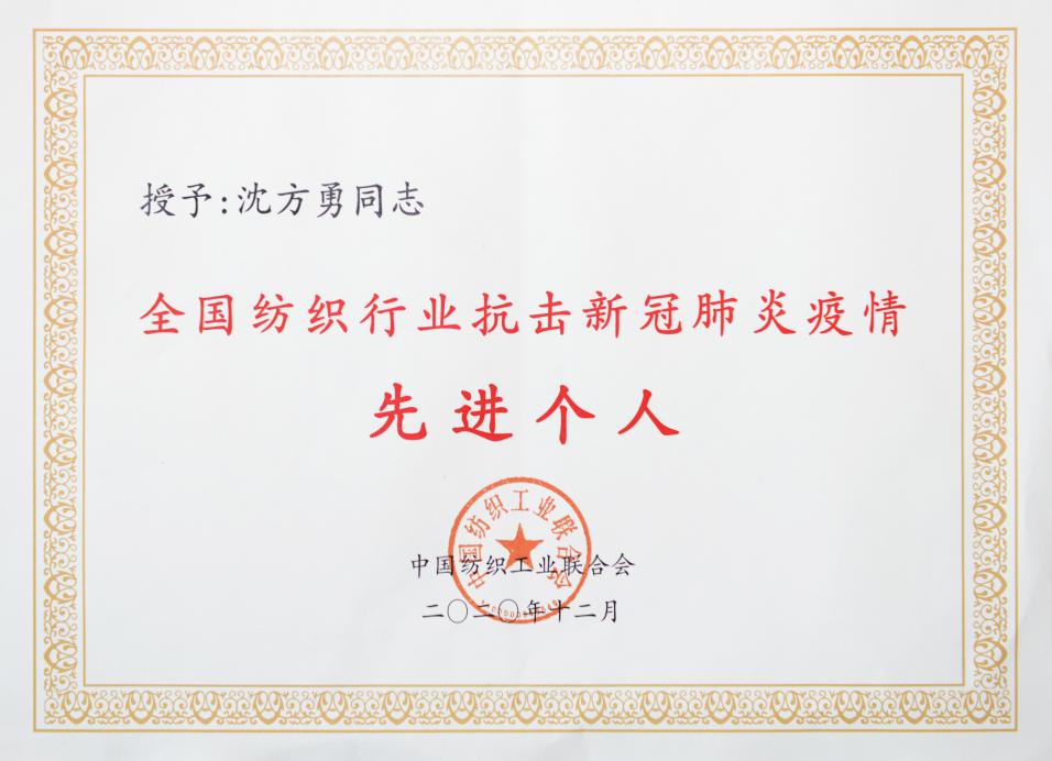 近日,中國紡織工業(yè)聯(lián)合會(huì)下發(fā)《關(guān)于表彰全國紡織行業(yè)抗擊新冠肺炎疫情先進(jìn)集體和先進(jìn)個(gè)人的決定》,天門紡機(jī)董事長(zhǎng)沈方勇獲評(píng)“全國紡織行業(yè)抗擊新冠肺炎疫情先進(jìn)個(gè)人”。