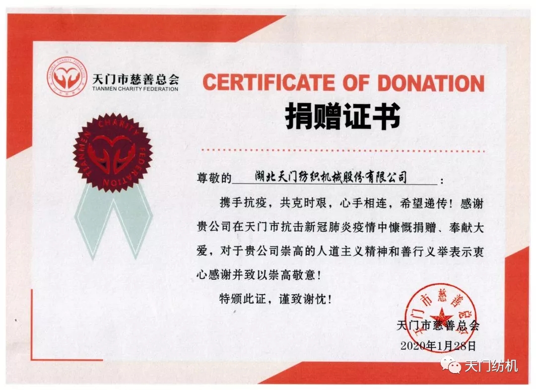 2020年,面對來勢洶洶的新冠疫情,作為一家民營企業,天門紡機不計經濟損失,率先提出了“不給黨和政府添麻煩,不給疫情防控添壓力,不給社會就業添負擔”,率先停產歇業,率先捐贈100萬元,專門用于收治新冠患者,采購短缺醫療物資。公司管理層還通過多種渠道,主動與有影響力基金會取得聯絡,分6個批次向醫院、社區捐贈了30萬只醫用口罩、10噸醫用消毒液、2萬件防護服等大量物資,在抗疫的危急時刻發揮了重要作用。