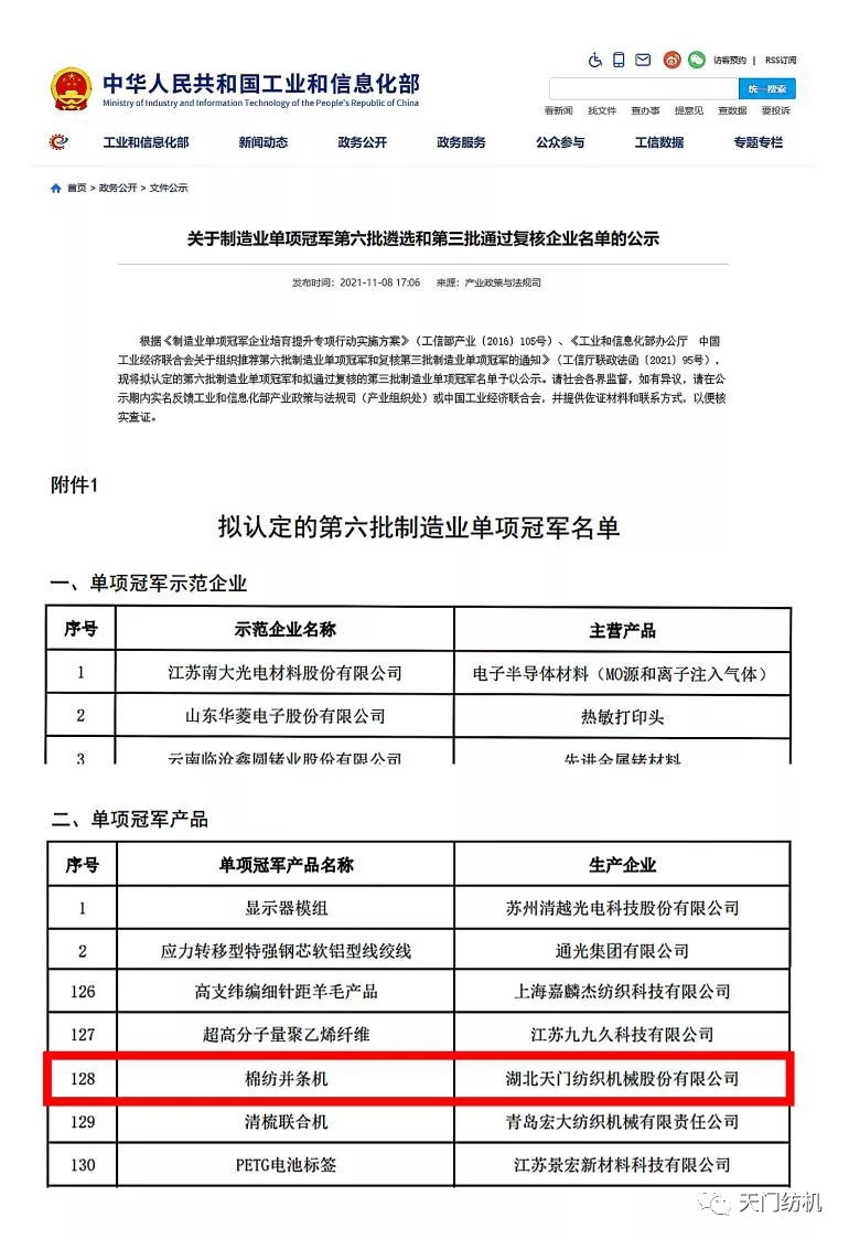 近日,國家工信部和中國工業經濟聯合會發布通知(工信廳聯政法函〔2021〕95號),擬認定天門紡機并條機為“單項冠軍產品”。至此,天門紡機所產的系列并條機成為了國內唯一獲此殊榮的棉紡并條機。