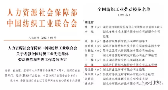 為表彰獎勵一批為國家紡織工業做出突出貢獻的先進集體和個人,近日,人力資源社會保障部、中國紡織工業聯合會決定(人社部發【2021】93號文),表彰全國紡織工業先進集體、勞動模范和先進工作者,天門紡機總工程師鄭強被授予“全國紡織工業勞動模范”榮譽稱號。