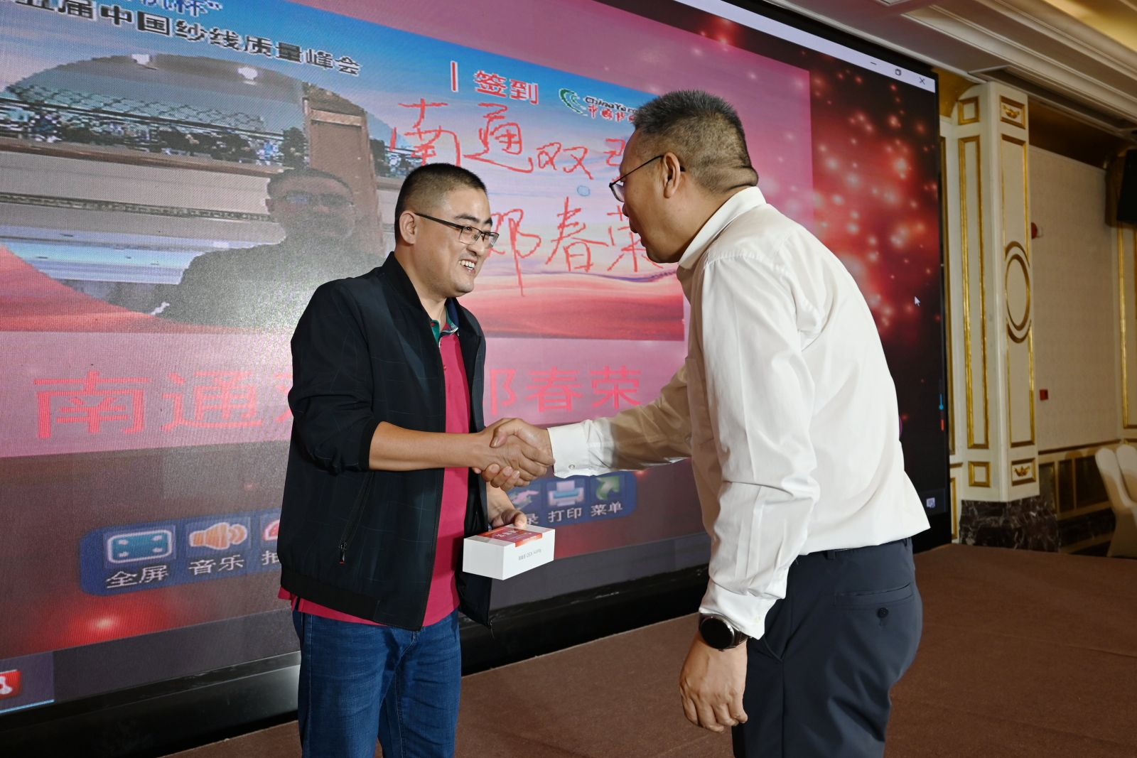 △天門紡機市場總監(jiān)周志宏、天門紡機副總經(jīng)理肖少華為抽獎環(huán)節(jié)獲獎代表頒獎