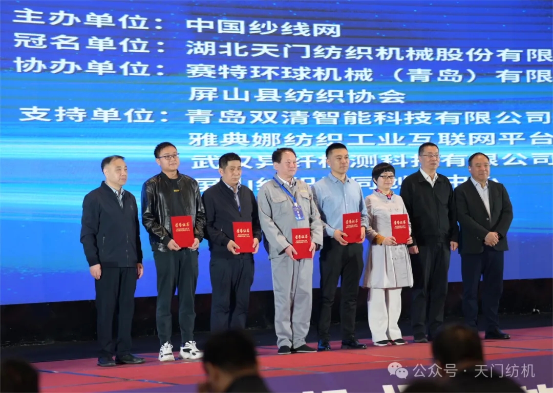 在領(lǐng)導(dǎo)和嘉賓致辭之后,舉行了“天門紡機(jī)杯”第12屆全國(guó)紡紗技術(shù)創(chuàng)新研討會(huì)論文頒獎(jiǎng)活動(dòng)。中國(guó)紡織機(jī)械協(xié)會(huì)會(huì)長(zhǎng)顧平、中國(guó)紗線網(wǎng)總編王果剛、天門紡機(jī)總經(jīng)理焦倫進(jìn)為獲獎(jiǎng)作者頒獎(jiǎng)。
